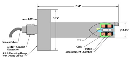 續(xù)電磁力的作用下來回移動(dòng)一個(gè)微型活塞。專利技術(shù)的電路分析活塞來回移動(dòng)行程的時(shí)間,從而測量絕對粘度。 一個(gè)內(nèi)置的RTD溫度測量探頭,實(shí)時(shí)測量測量室的溫度。