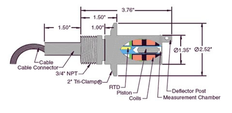 位于活塞上方的導(dǎo)流裝置,將液體導(dǎo)入測(cè)量室,活塞持續(xù)運(yùn)動(dòng)以不斷更新樣品,同時(shí)機(jī)械摩擦不斷擦洗測(cè)量室。 一個(gè)內(nèi)置的RTD溫度測(cè)量探頭,實(shí)時(shí)測(cè)量測(cè)量室的溫度。